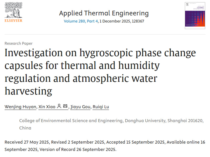 A research team from the College of Environment has developed an innovative hygroscopic phase-change capsule material that effectively regulates indoor temperature and humidity while harvesting atmospheric water. This dual-functional material achieves a high moisture absorption capacity of 0.58 g/g at 80% humidity and enables passive water production with a daily yield of 0.54 L/kg, demonstrating ...
