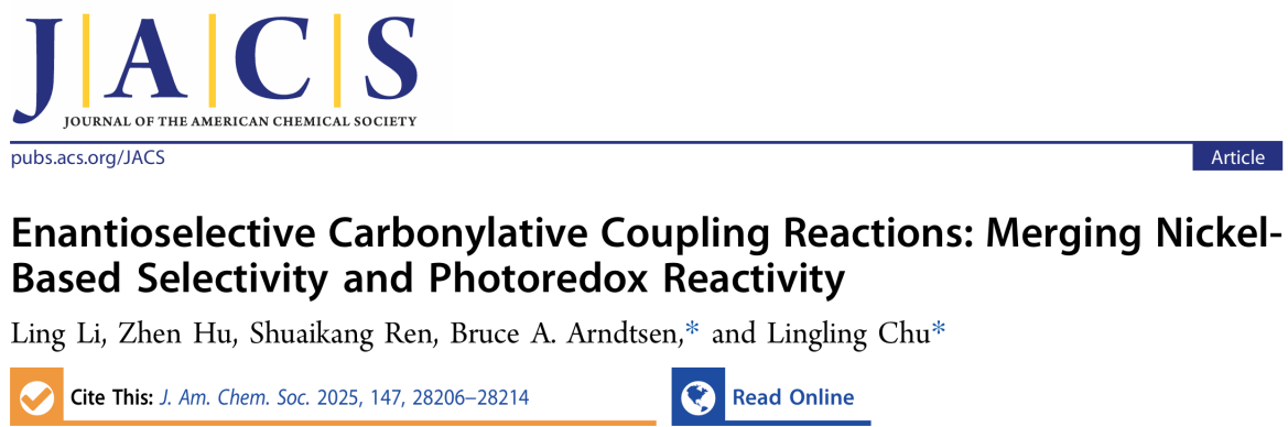 Recently, the research team led by Lingling Chu from the Center for Advanced Low-Dimensional Materials, in collaboration with the team of Bruce A. Arndtsen from McGill University in Canada, achieved significant progress in the field of enantioselective carbonylation coupling reactions. The findings were published in the Journal of the American Chemical Society. Ling Li, a doctoral student from our university, served as the first author of the paper, with Donghua University listed as the first corresponding institution.