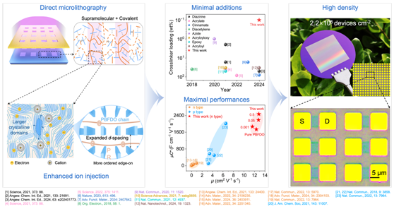 At the level of patternable precision manufacturing, the research team addressed the mass production requirements for high-density flexible/bioelectronics by proposing a novel ‘direct micro-photolithography (DML) via supramolecular synergy’ paradigm. By introducing trace amounts (<0.1 wt%) of a polyrotaxane crosslinker, a dual network combining hydrogen bonding and photo-induced covalent bonding was constructed within an organic ion-electron mixed conductor (PBFDO), enabling coordinated regulation of the polymer microstructure and ionic channels. While maintaining excellent ion/electron coupling, the process achieved a pattern resolution of 600 nm and wafer-scale OECT integration with a density of 2.2×10⁵ devices•cm⁻², significantly enhancing device mobility and transconductance. These findings have been published in Advanced Materials.