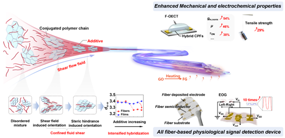 Figure 3. High-performance conjugated polymer fibers and subsequent fiber-based organic electrochemical transistors fabricated through shear-enhanced hybridization