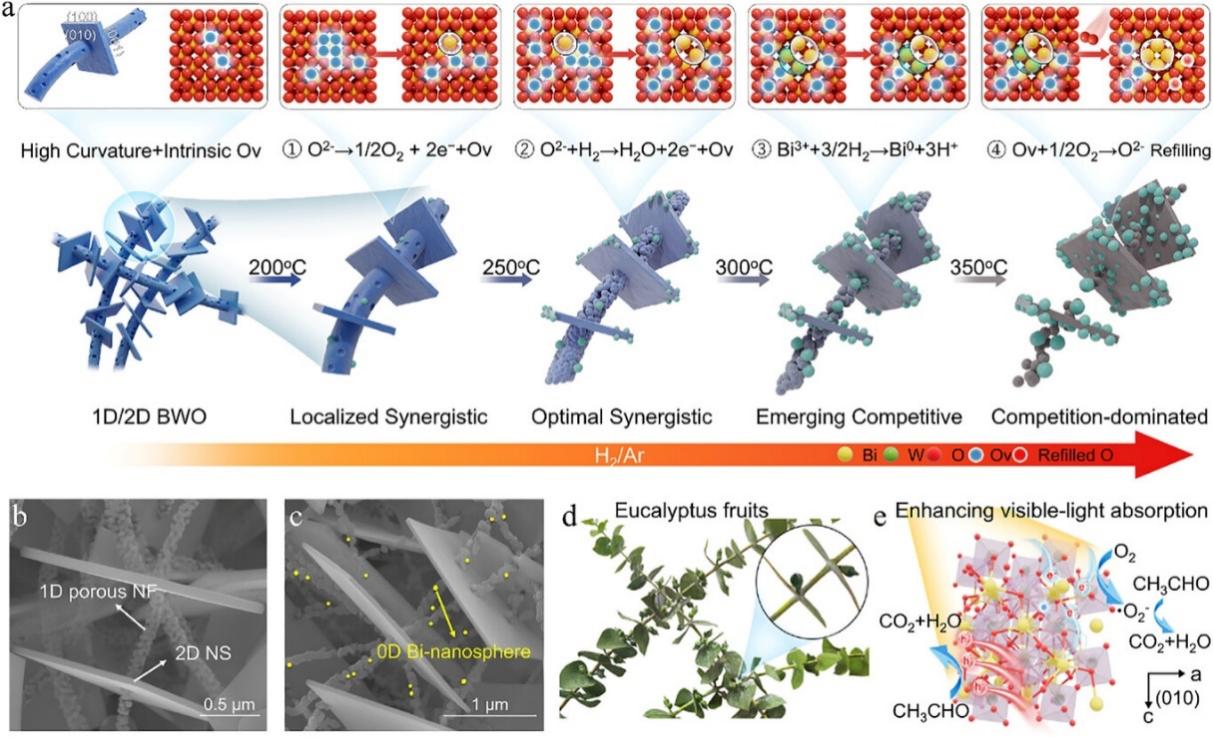 Inspired by the segmented growth pattern of eucalyptus fruits along branches in nature, the research team proposed a spatially selective reduction strategy induced by heterostructures, successfully synthesizing a novel 0D/1D/2D Bi-BWO hierarchical photocatalyst. This approach led to the formation of a spatially ordered bismuth metal nanosphere network, establishing a dynamically evolving ‘metal-defect’ system that ultimately enhanced photocatalytic performance. The catalyst achieved complete degradation of acetaldehyde within one hour without any additives, exhibiting a degradation rate 3.5 times higher than that of unmodified 1D/2D BWO. Furthermore, it maintained stable performance over five consecutive cyclic tests, demonstrating excellent stability and promising application prospects.