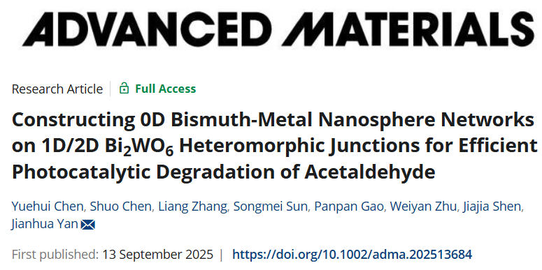 Recently, the research team led by Professor Yan Jianhua from the College of Textiles at Donghua University has made new progress in the study of visible-light degradation of organic pollutants. The related findings have been published in the international journal Advanced Materials (2025, e13684) under the title: “Constructing 0D Bismuth-Metal Nanosphere Networks on 1D/2D Bi2WO6 Heteromorphic Junctions for Efficient Photocatalytic Degradation of Acetaldehyde.”