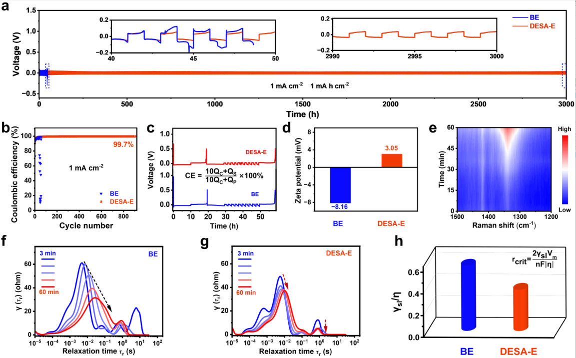 The DESA-E system significantly improves zinc deposition&stripping performance. The symmetric cell demonstrates stable cycling for 3,000 hours at 1 mA cm⁻², and the asymmetric cell achieves over 900 cycles, both far surpassing the conventional BE system. The adsorbed [PeMIM]⁺ on the zinc surface reduces water molecule adsorption and creates an electrostatic shielding effect, guiding uniform Zn²⁺ deposition and synergistically enhancing interfacial stability and reaction kinetics (Figure 4).