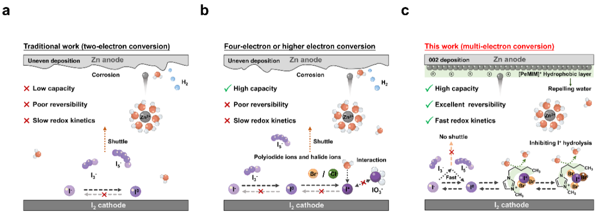 Aqueous zinc–iodine (Zn–I₂) batteries are regarded as highly promising energy storage systems due to their high safety, abundant resources, and low cost. Benefiting from the variable oxidation states of iodine, this system holds potential for high-capacity energy storage. However, conventional Zn–I₂ batteries primarily rely on the two-electron conversion between I⁻ and I⁰, which results in limited capacity, sluggish reaction kinetics, and pronounced shuttle effects. In recent years, strategies such as introducing halide ions (e.g., Cl⁻, Br⁻) to modulate iodine valence have enabled the formation of interhalogen compounds and multielectron reactions. Nevertheless, multielectron systems still face challenges such as hydrolysis of highvalent iodine species, interfacial instability, and poor reversibility. Therefore, constructing systems that can stabilize highvalent iodine intermediates and accelerate electrochemical reaction kinetics is a key pathway toward achieving highly efficient and reversible multielectron Zn–I₂ batteries.