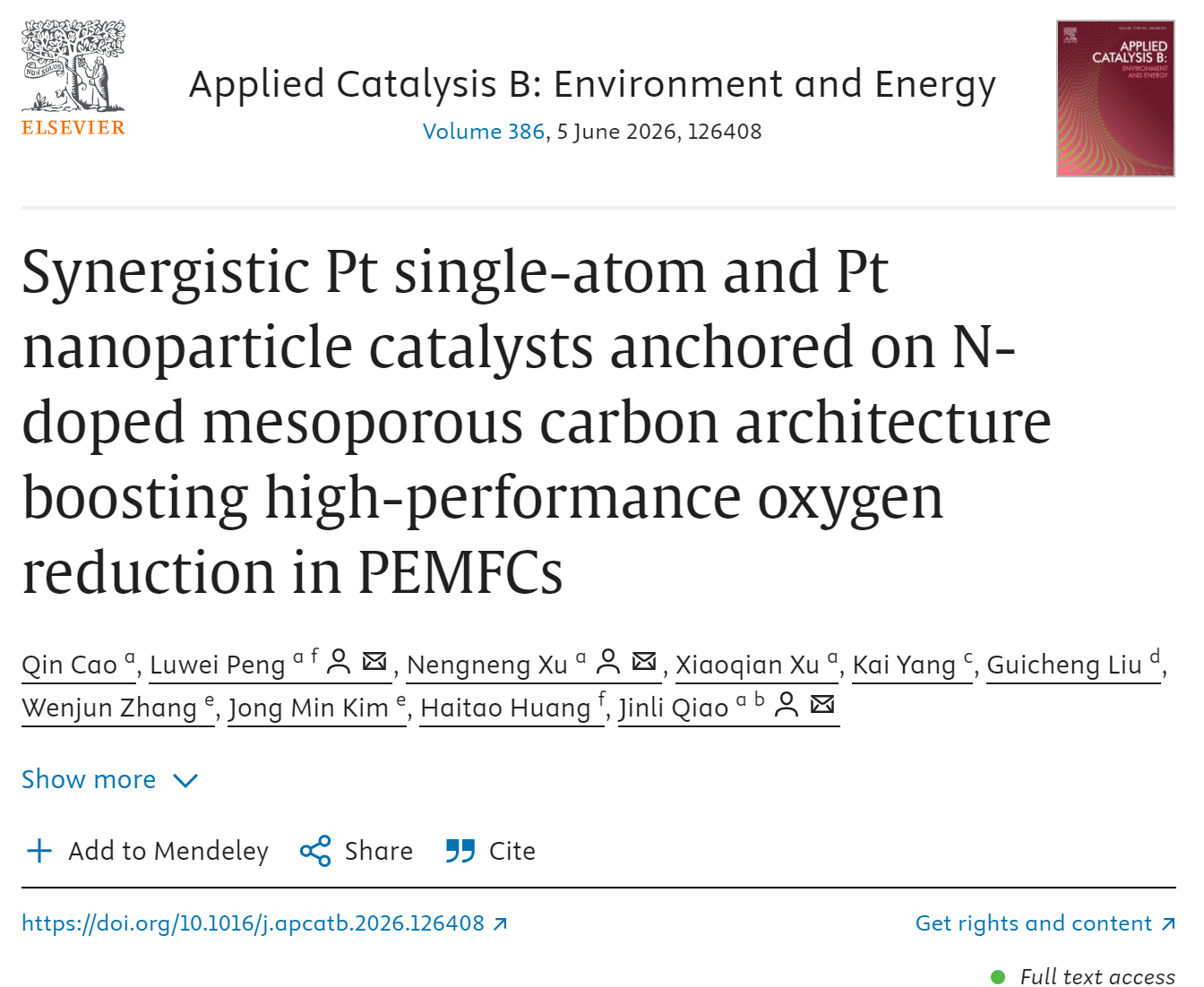 Recently, Professor Jinli Qiao’s research team from the College of Environmental Science and Engineering has made significant progress in the field of proton exchange membrane fuel cells. The related findings were published in the internationally renowned journal in electrochemistry, Applied Catalysis B: Environmental and Energy, under the title “Synergistic Pt Single-Atom and Pt Nanoparticle Catalysts Anchored on N-Doped Mesoporous Carbon Architecture Boosting High-Performance Oxygen Reduction in PEMFCs.”
