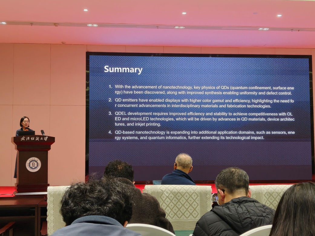 On the afternoon of March 26, the Party Committee Office for Talent Development, the State Key Laboratory of Textile New Materials and Advanced Processing Technologies, and the School of Microelectronics jointly organized a special academic salon, inviting the two distinguished experts to deliver lectures on cutting-edge technologies in optoelectronic devices and displays. Professor Eunjoo Jang presented a talk titled "Perspectives on Quantum Dot Technology: Small Success & Big Impact," in which she systematically reviewed the complete development trajectory of quantum dot technology — from fundamental physics discoveries to its core applications in the high-end display industry — demonstrating the profound impact of micro-nano technological breakthroughs on the global industrial landscape. Dr. James (Jueng-Gil) Lee delivered a lecture titled "The Latest Technology Breakthroughs of Flexible Printed OLED Display Technology," introducing the latest advances in flexible printed OLED display technology while discussing its future development trends in smart devices and emerging display scenarios from the perspective of industrialization pathways. The two presentations provided the faculty and students with in-depth academic insights and industry-oriented perspectives on the latest cutting-edge information in optoelectronic display science and technology.